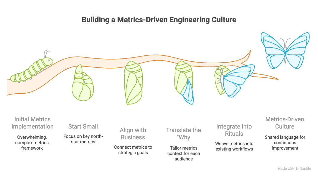When we roll out a new product, we ship an MVP, collect feedback, and iterate. For some reason, we often forget this approach when it comes to our internal processes. Engineering leaders, in their excitement, sometimes try to measure everything at once, crushing their teams under the weight of too many new metrics.
