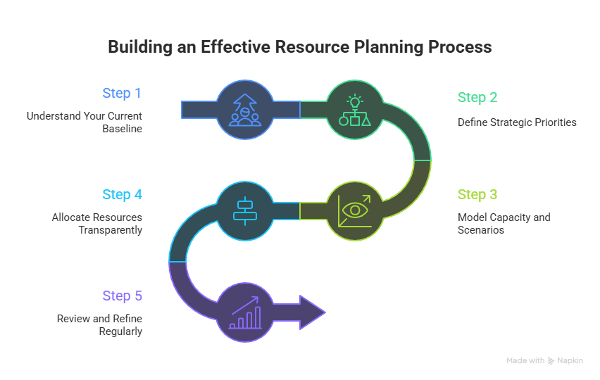 Implementing resource planning doesn’t require complex tools; it requires discipline and clarity. Here’s a simple framework that scales with your team: