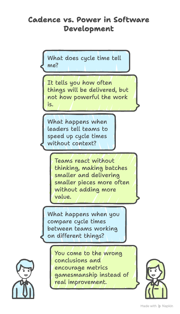 Your cadence in software development is the cycle time. It tells you how often things will be delivered. It doesn't tell you how powerful the work being done in each cycle is, like how big, complicated, or valuable it is.