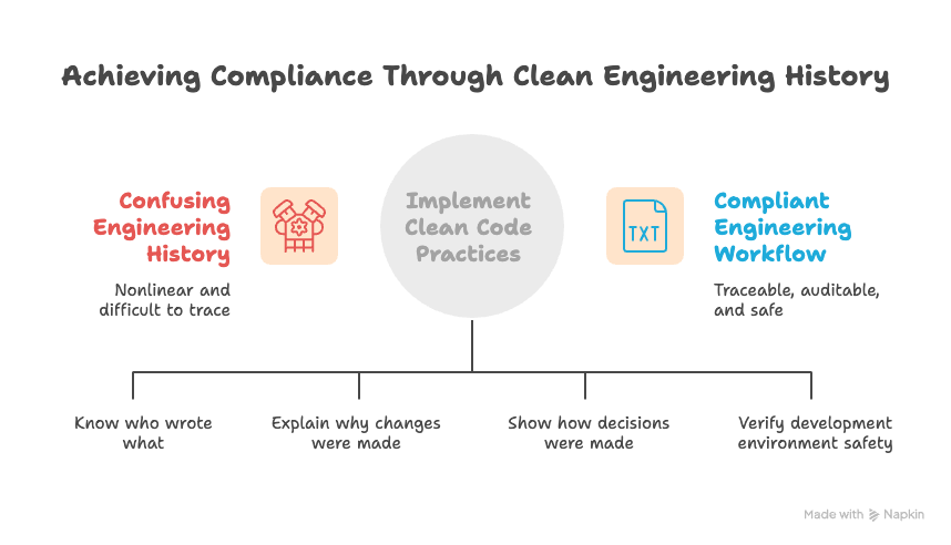 You can’t show any of that if your engineering history looks like the plot of a Christopher Nolan movie—nonlinear and confusing. Clean code entails clean history, which equals compliance.