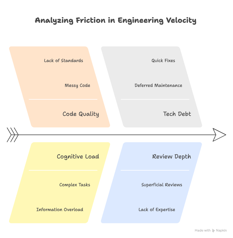 When code health drops, everything slows down. PR reviews take longer because the logic is convoluted. Handoffs get messy because documentation is stale. Bugs multiply. Onboarding becomes a nightmare for new hires who spend weeks just trying to set up their local environment.