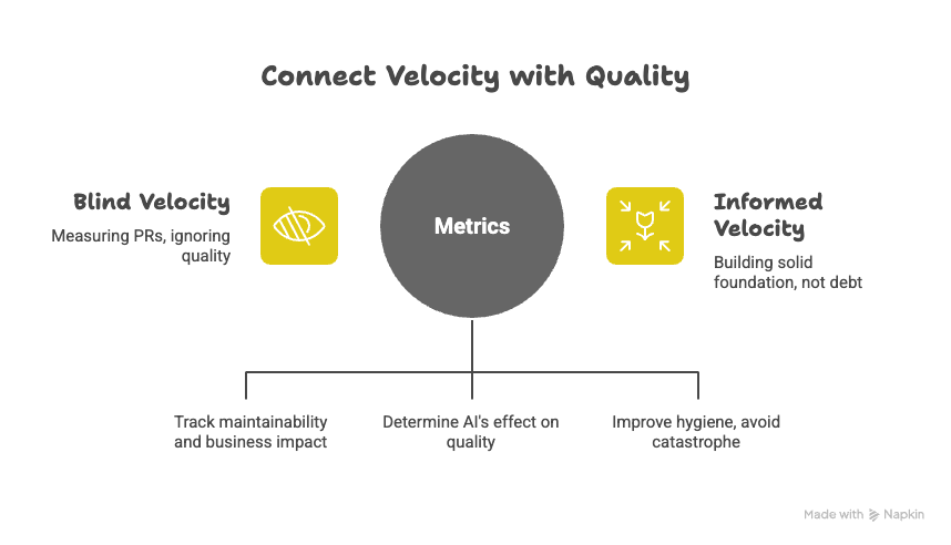 The critical question: How do you connect your new velocity metrics (Process) with your quality and maintainability metrics (Business Impact)?